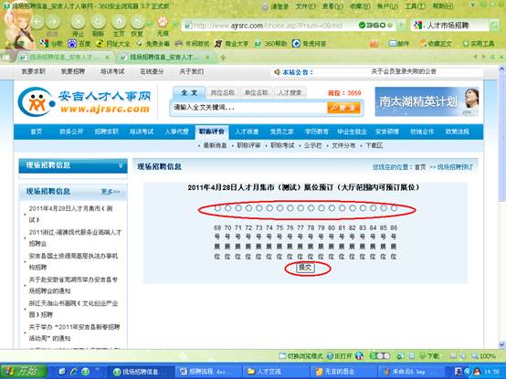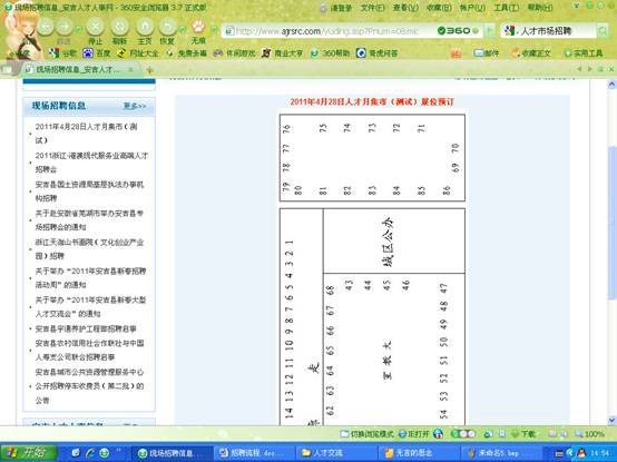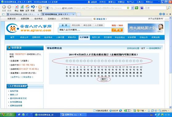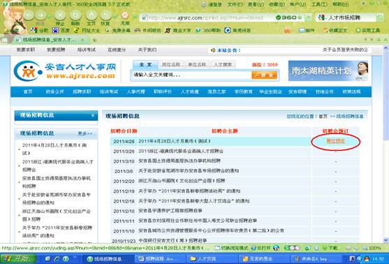 1. 安吉縣人才市場固定招聘展位85個,4月28日試運行網(wǎng)上展位預(yù)訂系統(tǒng)(網(wǎng)上展位預(yù)訂操作詳見后面的網(wǎng)上展位預(yù)訂操作流程),5月8日正式實行。