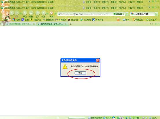 第七步:點擊確定,網(wǎng)上預(yù)訂展位成功后,請在招聘日前一天到人才市場窗口繳費確認(rèn)。