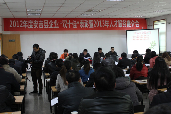 近日,由縣委組織部、縣人力資源和社會(huì)保障局主辦,縣人才資源開發(fā)管理辦公室承辦的安吉縣2012年度企業(yè)“雙十佳”表彰暨2013年人才服務(wù)推介會(huì)在縣人才資源開發(fā)管理辦公室舉行。各企業(yè)人力資源精英、鄉(xiāng)鎮(zhèn)人力社保所所長(zhǎng)和新聞媒體朋友等共100余人參加會(huì)議。中共安吉縣委組織部副部長(zhǎng)、縣人力資源和社會(huì)保障局局長(zhǎng)、黨組書記吳有才、中共安吉縣委組織部副部長(zhǎng)程曉波、縣人力資源和社會(huì)保障局副局長(zhǎng)、黨組成員沈玉琴、黨組成員李豐等領(lǐng)導(dǎo)出席會(huì)議。會(huì)議由中共安吉縣委組織部副部長(zhǎng)程曉波主持。