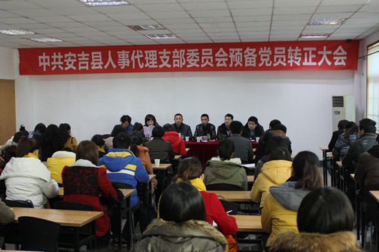 2013年1月18日,中共安吉縣人事代理支部召開(kāi)預(yù)備黨員轉(zhuǎn)正大會(huì),人事代理支部書(shū)記李曉強(qiáng)主持會(huì)議,大會(huì)同意錢(qián)俊杰等68名同志按期轉(zhuǎn)為中共正式黨員。