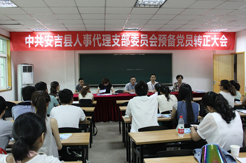 7月5日下午,中共安吉縣人事代理支部第二季預(yù)備黨員轉(zhuǎn)正大會(huì)在人才開發(fā)辦舉行,大會(huì)全票通過(guò)潘以晴等39名同志的預(yù)備期考察。